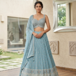 A refreshing aqua blue lehenga set featuring delicate floral embroidery, a beautifully detailed blouse, and a graceful dupatta—perfect for festive occasions and elegant celebrations. ✨