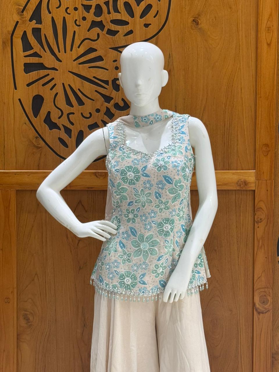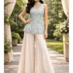 A graceful aqua blue embroidered kurti paired with flowy ivory palazzos, crafted for effortless elegance. Delicate floral detailing and a soft silhouette make this ensemble perfect for festive gatherings, daytime celebrations, and intimate occasions.