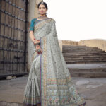 A very elegant grey-colored silk saree with multi-colored work on it of resham threads. It comes with a designer contrast blue blouse piece. This saree is exceptional and speaks for itself. It comes with a very heavy and beautiful pallu with borders.