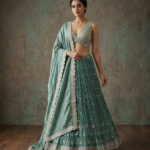 A graceful light green lehenga set featuring a pleated skirt with delicate embellishments, a finely embroidered blouse, and a shimmering dupatta with an ornate border—perfect for festive and evening occasions.