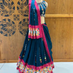 A designer chaniya choli specially made for Navratri. The pattern of the blouse is completely different, and the chaniya also has amazing gher. It is paired with a self-mirror work dupatta.