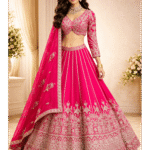 An opulent rani pink lehenga set featuring exquisite zari and thread embroidery, a sculpted blouse, and a delicately embellished dupatta. Designed to make a statement at weddings, receptions, and festive occasions, this ensemble blends timeless tradition with royal elegance