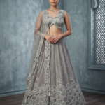 An elegant statement in muted grey, this contemporary lehenga set features a delicately embroidered blouse paired with a flowy, finely pleated skirt. Intricate threadwork and sequin detailing along the hem add a touch of shimmer, while the sheer dupatta with ornate border completes the look with graceful charm. Perfect for cocktail evenings, receptions, or festive celebrations where subtle sophistication takes centre stage.
